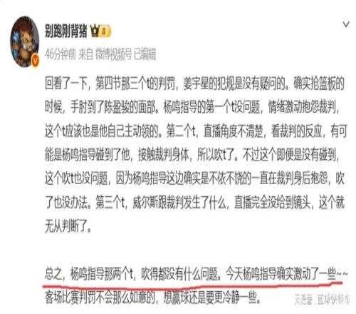 不過(guò),在第四節(jié)還剩下6分多鐘時(shí),姜宇星與陳盈俊的一次拼搶中,姜宇星的手打到了陳盈俊,隨后裁判響哨,吹罰了姜宇星犯規(guī)。這本該是一次正常不過(guò)的犯規(guī)。不過(guò),當(dāng)時(shí)站在場(chǎng)邊的楊鳴卻認(rèn)為,陳盈俊這球有假摔嫌疑,姜宇星的動(dòng)作并不大。隨即,楊鳴直接上前找裁判理論,現(xiàn)場(chǎng)火力全開(kāi),嘴里喋喋不休的怒噴裁判。而對(duì)于見(jiàn)慣大場(chǎng)面的裁判,他們也似乎不給面子,直接吹了楊鳴一個(gè)T。