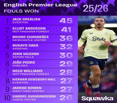 當地時間12月18日,知名數據機構Squawka發布了2025/26賽季英超聯賽被犯規次數榜(截至第16輪),埃弗頓球員格拉利什被犯規45次位居榜首。
