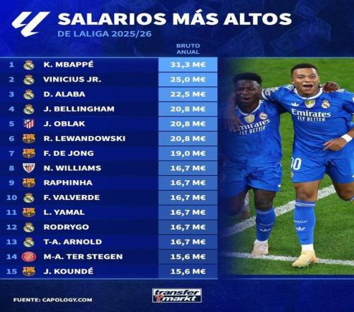 北京時間1月23日,德國轉(zhuǎn)會市場官方列出了西甲球員稅后年薪榜排名,其中皇馬球員包攬前四,奧布拉克第五。
