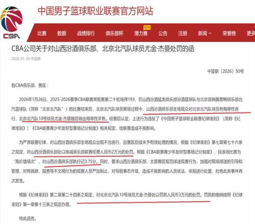 1月28日,下午5點!CBA公司給山西隊開出一份罰單,同時,對北京隊外援杰曼,也是進行了罰款!