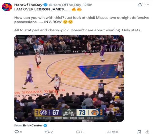 著名詹黑媒體賽后吐槽勒布朗的防守(正好就是湖人第三節崩盤的開始):我對勒布朗-詹姆斯已經厭倦了,他這樣打球怎么可能贏?看看這個瞬間吧,連續兩個防守回合都漏人,他只顧著刷數據、挑有利數據的位置,他根本不在乎輸贏,只在乎數據。