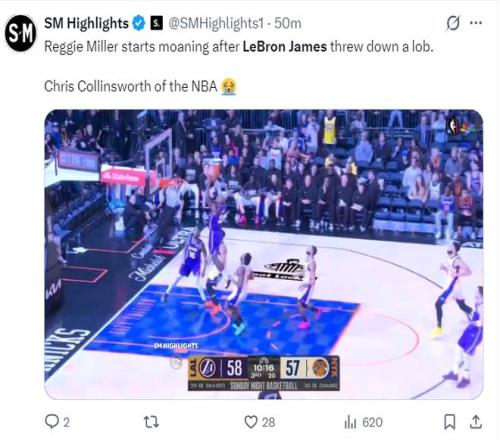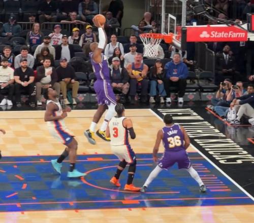 這場比賽41歲的勒布朗-詹姆斯又成為麥迪遜廣場花園最閃耀的那顆星,他在上半場就完成了一次空接暴扣,這一球斯瑪特傳給他恰到好處,詹姆斯高高躍起完成了平筐空接。